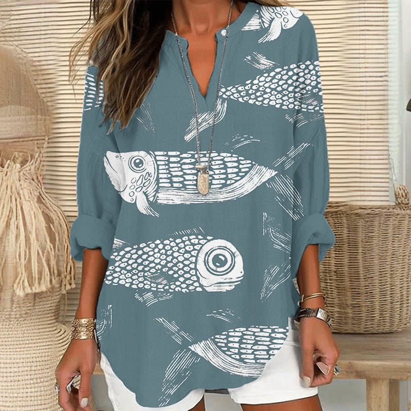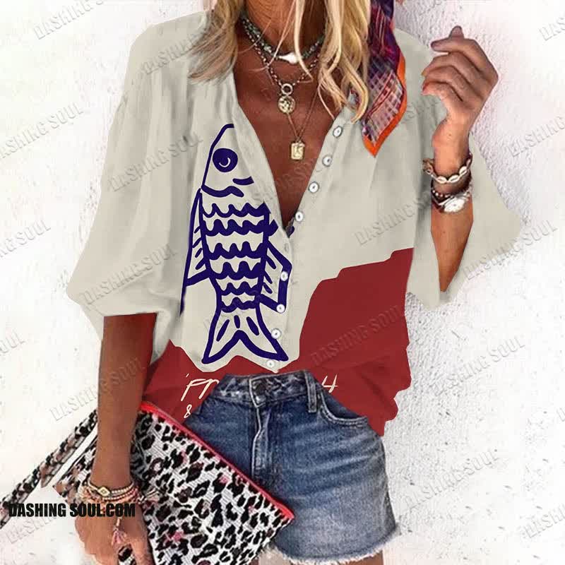 Women's Casual Silme Drawing Pnesh Fish Art Print V Neck Long Sleeve Blouse