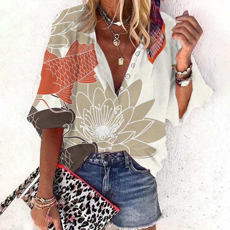 Dashingsoul Women's Good Luck Koi Fish Lotus Print Casual 3/4 Sleeve Blouse