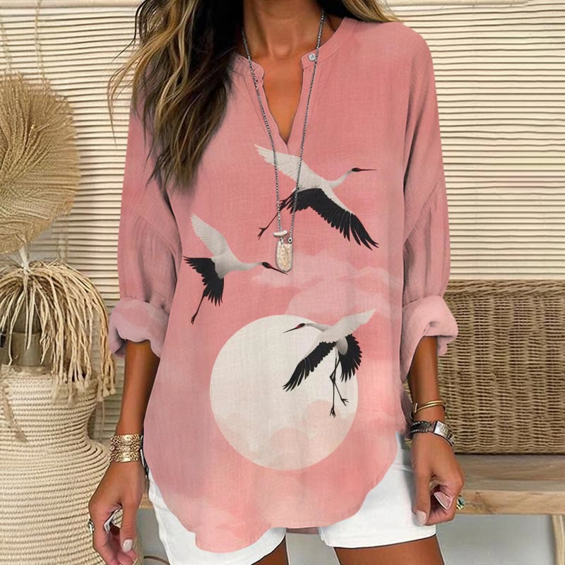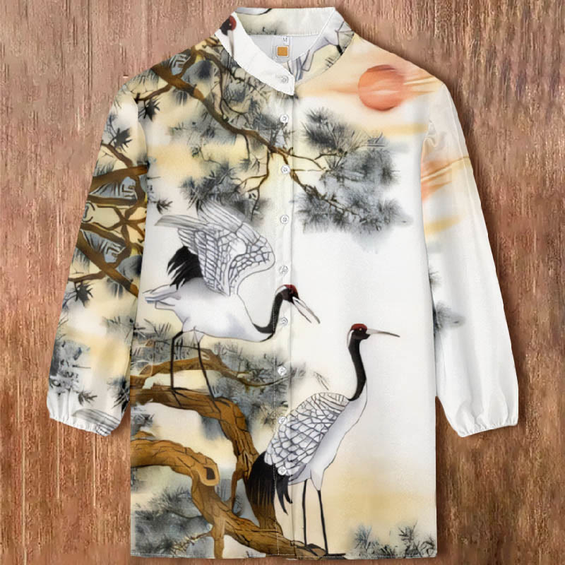 Dashingsoul Cranes At Sunrise Japanese Art Print V Neck Long Sleeve Blouse