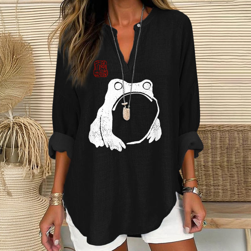 Dashingsoul Frog Ancient Japanese Art Print V Neck Long Sleeve Blouse