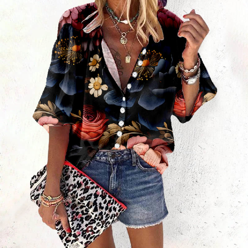 Vintage Floral Art Print V-Neck Half Sleeve Blouse