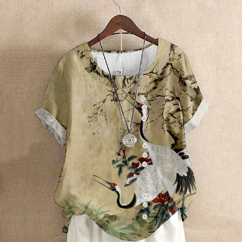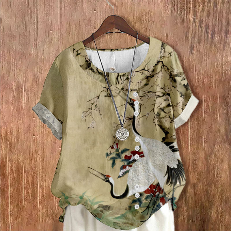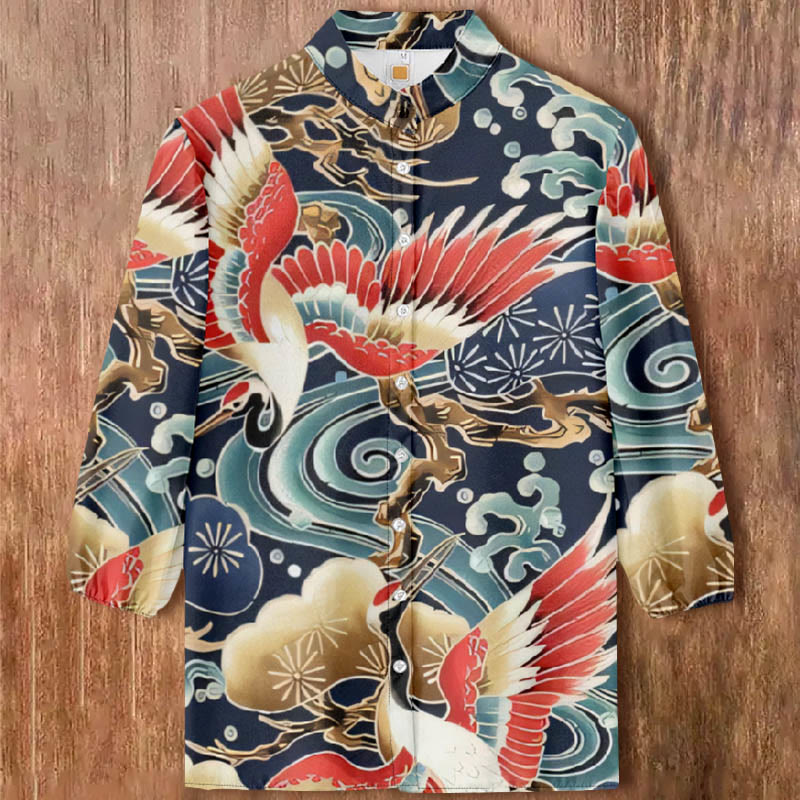 Dashingsoul Women's Oil Painting Red-crowned Crane Art Print Casual 3/4 Sleeve Blouse
