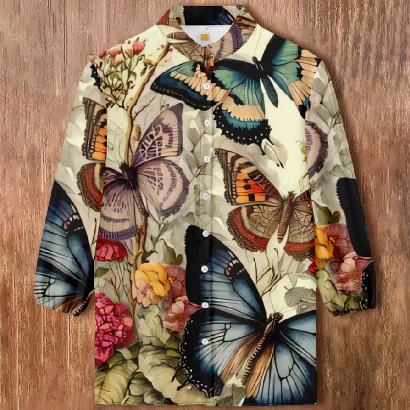 Dashingsoul Women's Colorful Butterfly Collecting Nectar Print Casual 3/4 Sleeve Blouse