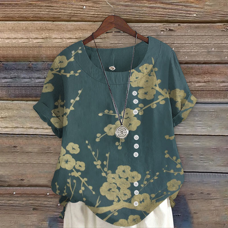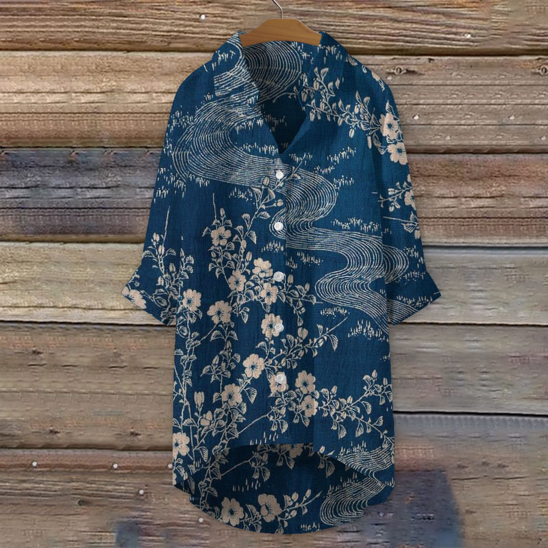 Women's Japanese Art Plum Blossom Print Casual 3/4 Sleeve Blouse