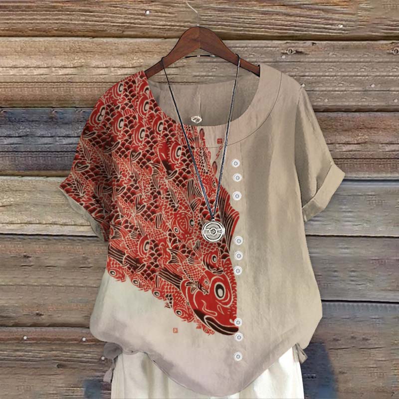 Dashingsoul Retro Japanese Abstract Koi Fish Art Print Short Sleeve Blouse