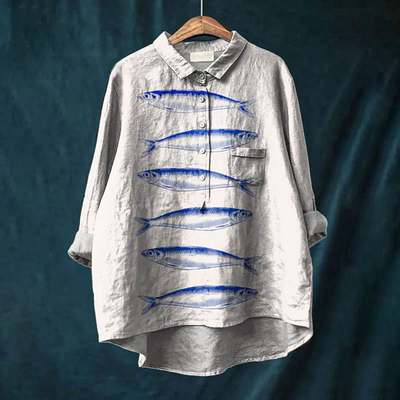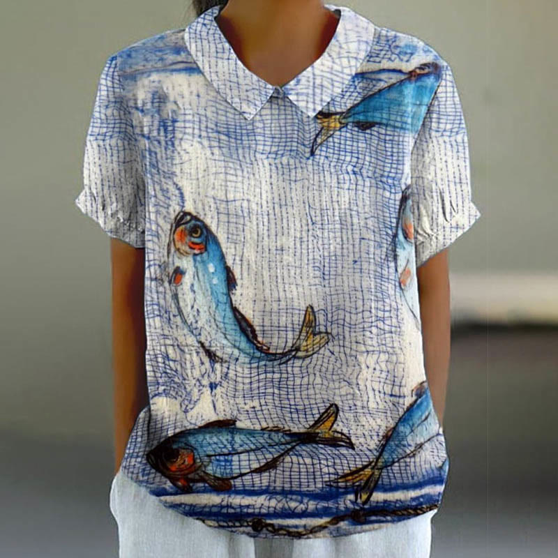 Dashingsoul Women's Lovely Sardines In Sequence Art Print Casual Lapel Blouse