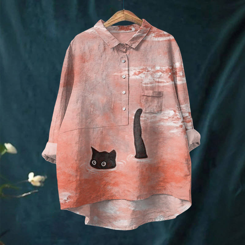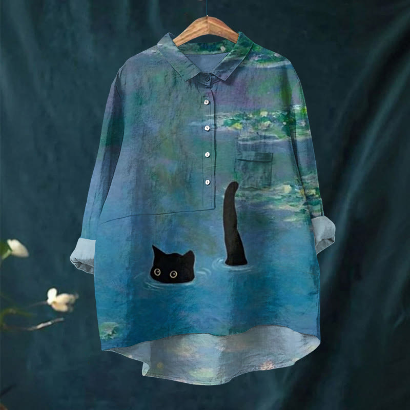 Dashingsoul Women's Oil Painting Cat Art Print Casual Lapel Blouse