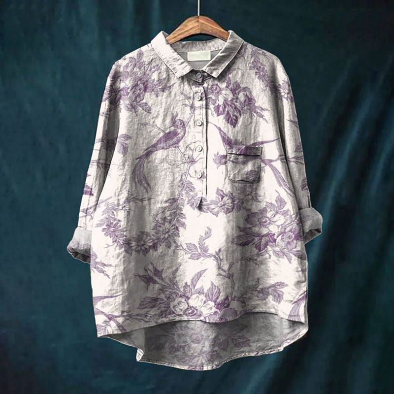 Dashingsoul Women's Vintage Birdsong And Flowers Art Print Casual Lapel Blouse