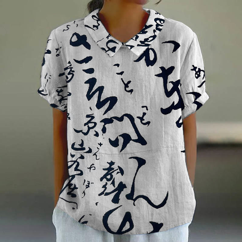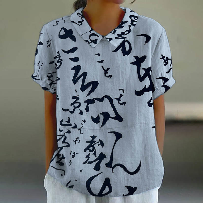 Dashingsoul Women's Japanese Characters Art Print Casual Lapel Loose Blouse