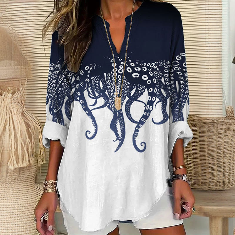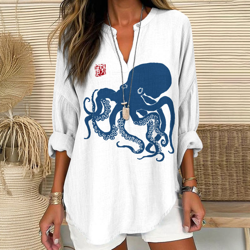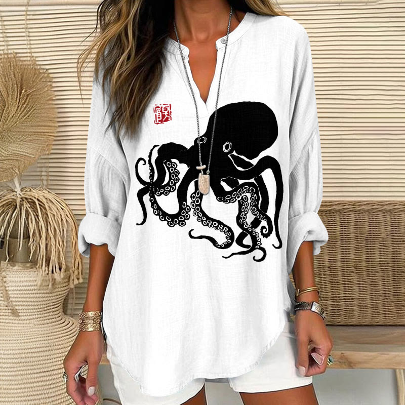 Dashingsoul Octopus Japanese Lino Art Print V Neck Long Sleeve Blouse