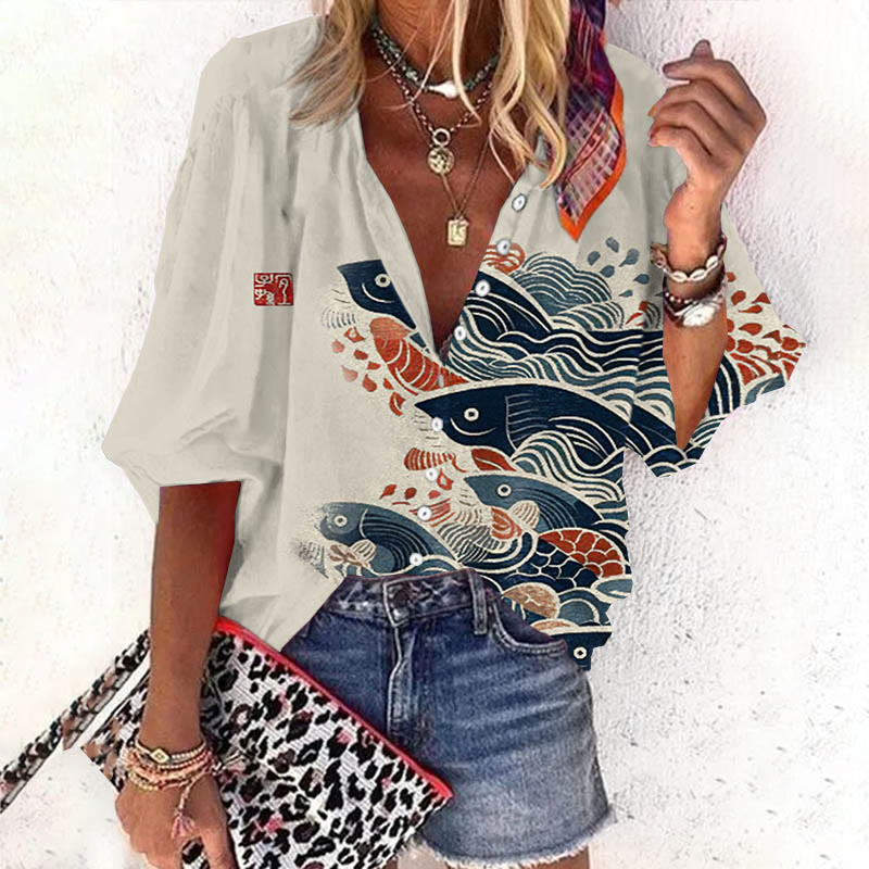 Dashingsoul Women's Japanese Art Carp Print Casual 3/4 Sleeve Blouse