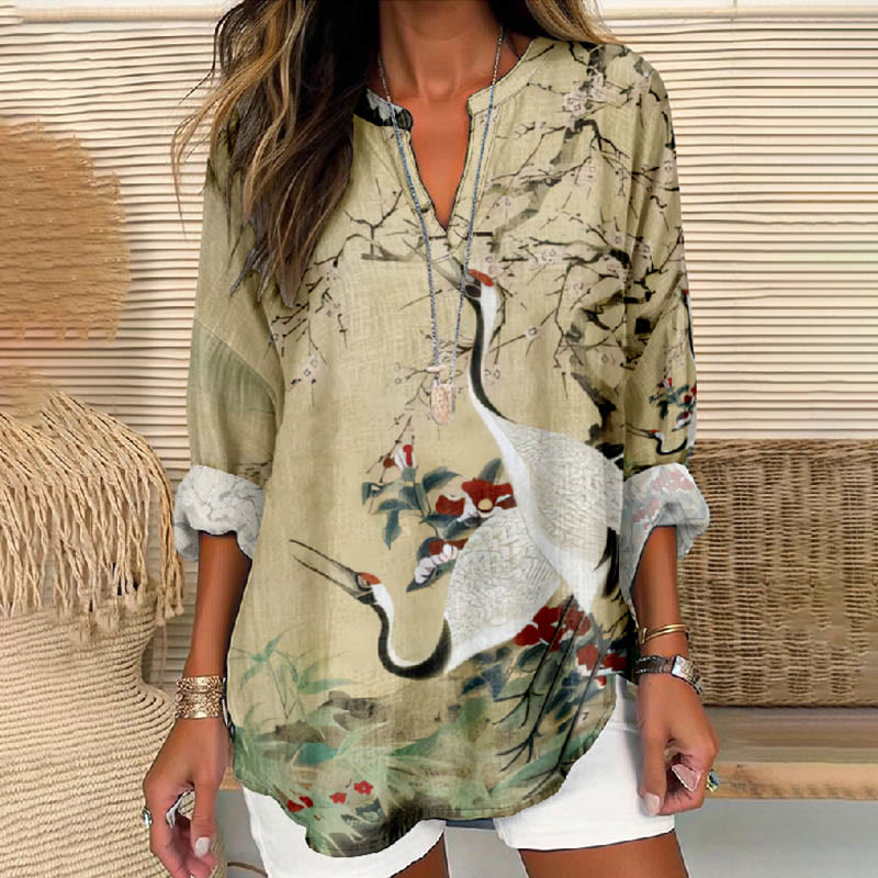 Dashingsoul Women's Oil Painting Chirping Crane Floral Print V Neck Long Sleeve Blouse