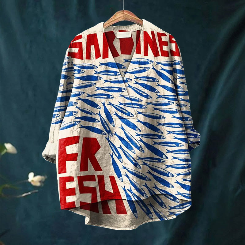 Vintage Fish Sardines Art Printed Casual V-neck Shirt