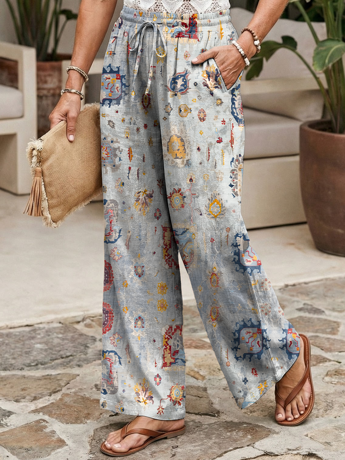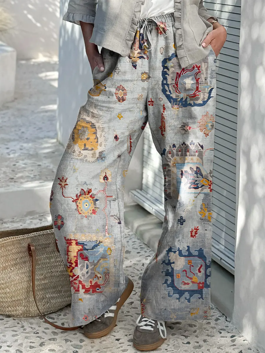 Ethnicity Geometry Flowers Arc Women's Printed Cotton And Linen Casual Pants$42.99 USD -