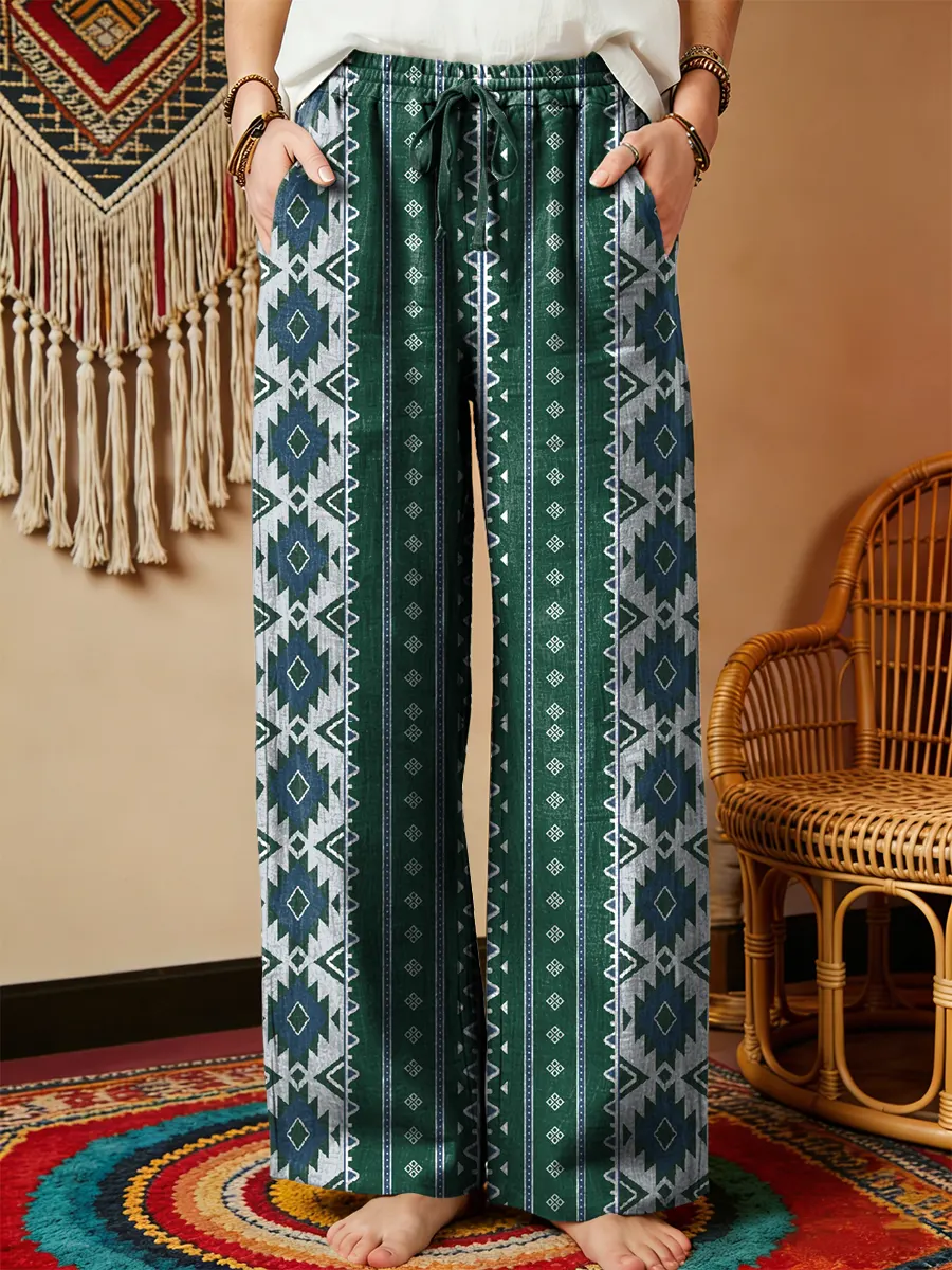 Ethnicity Geometry Totem Green Women's Printed Cotton And Linen Casual Pants$42.99 USD -