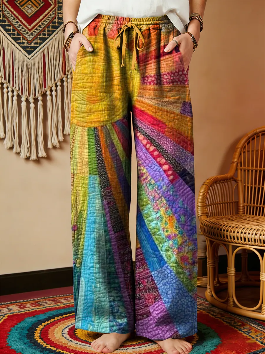Vintage Sun Patchwork Art Women's Printed Cotton And Linen Casual Pants$42.99 USD -