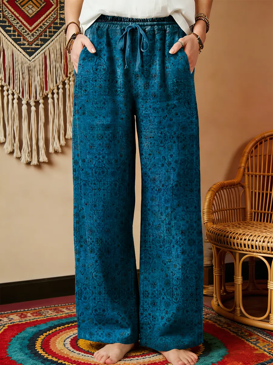 Women's Vintage Ethnic Blue Floral Art Print Cotton Linen Casual Pants$39.99 USD -