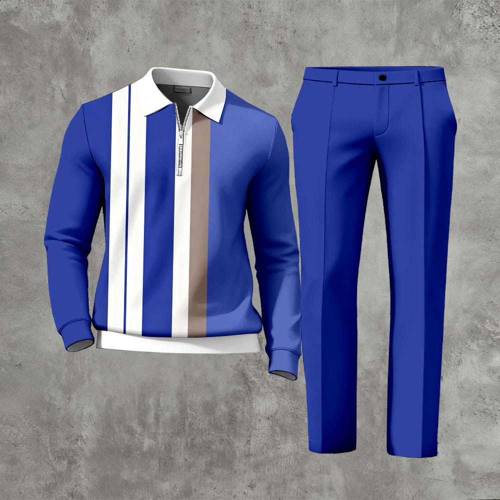 Men's Casual Striped Print Polo Collar Zipper Long Sleeve Pants Two-Piece Set