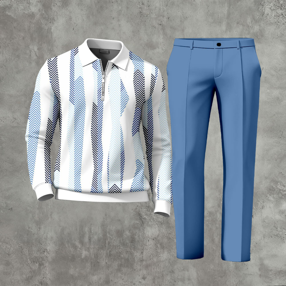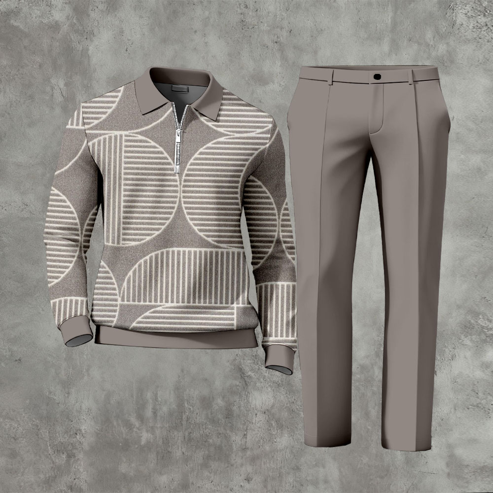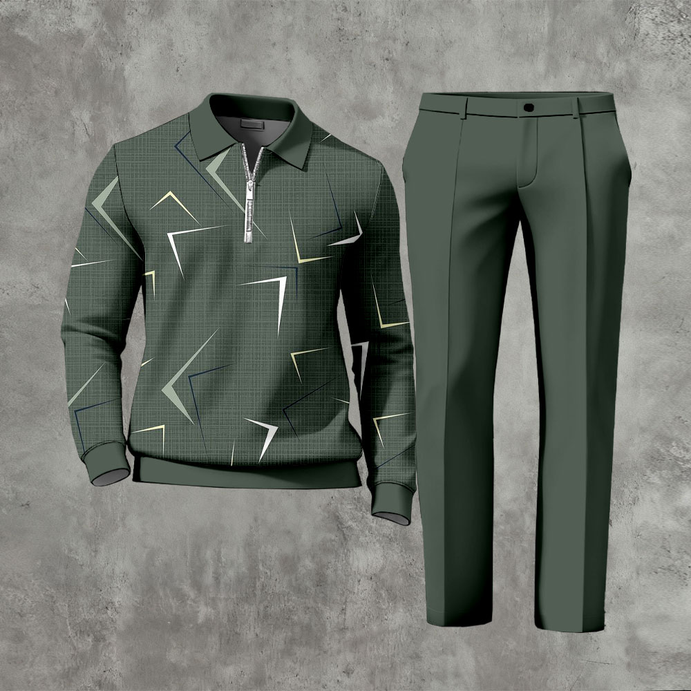 Men's Casual Geometric Print Polo Collar Zipper Long Sleeve Pants Two-Piece Set