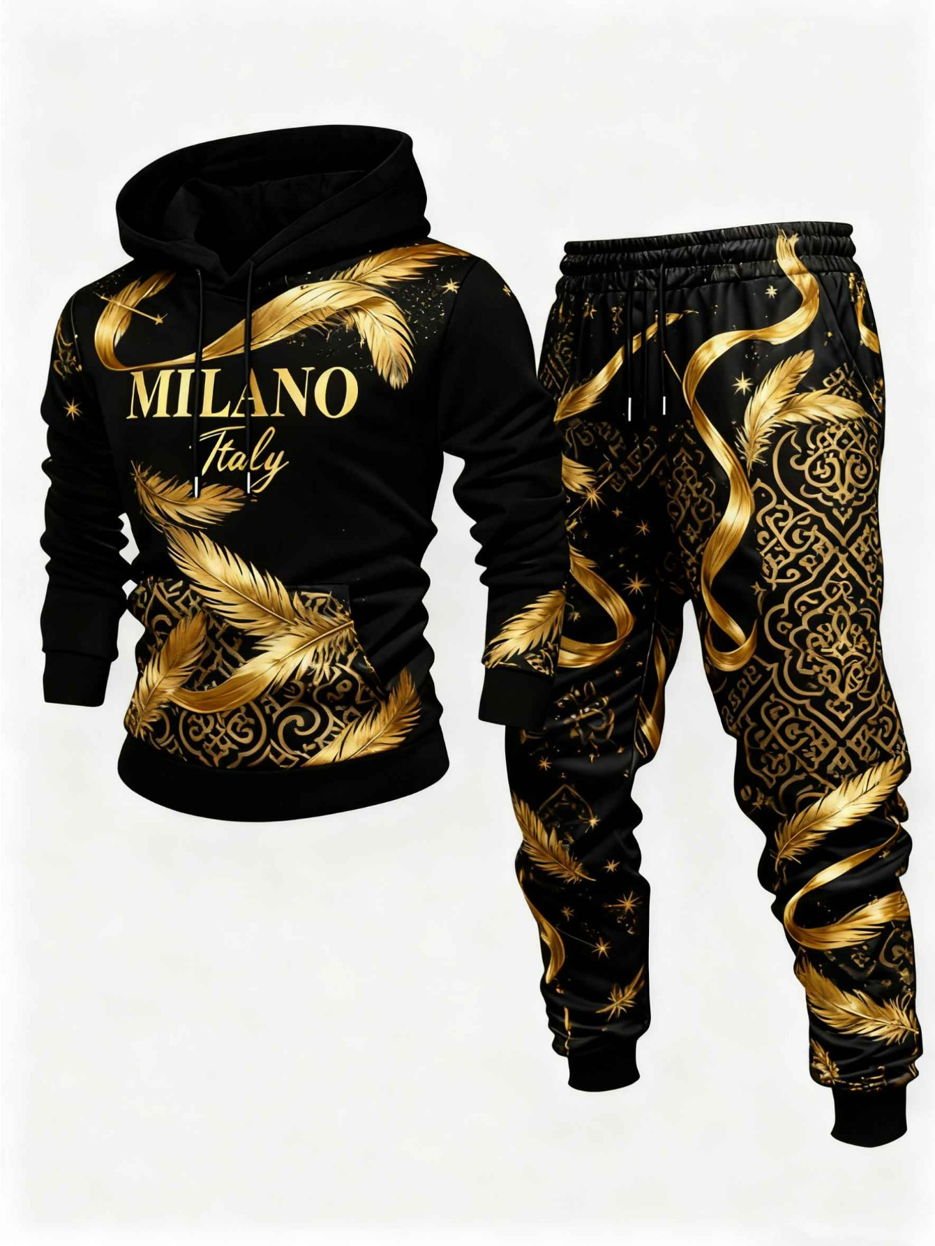 Men's Casual Black & Gold Color Matching Feathers And Ribbons Printed Hoodies Long Sleeved Sweatshirts & Sweatpants Two-Piece Set