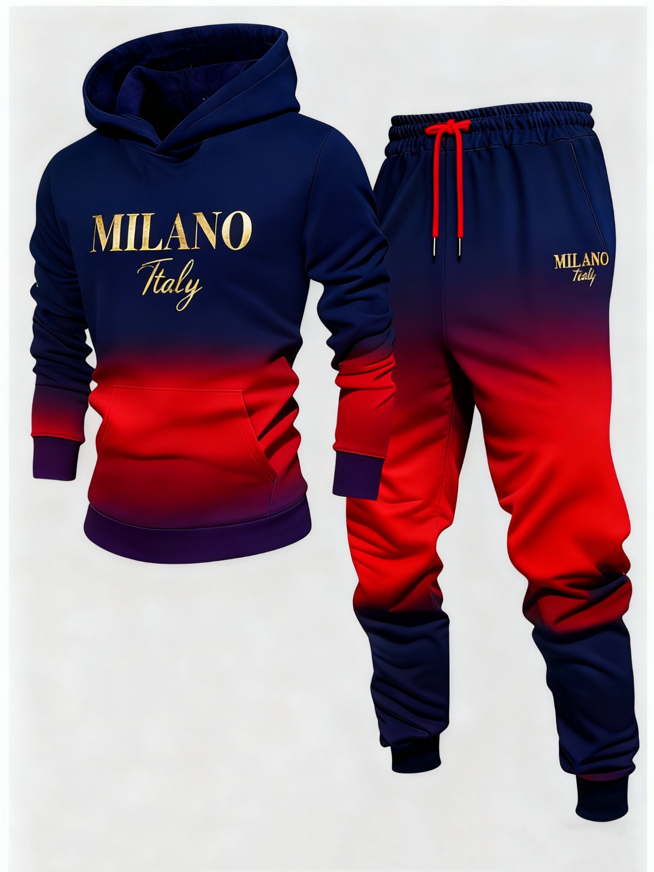 Men's Casual Navy Blue & Red Color Gradient Printed Hoodies Long Sleeved Sweatshirts & Sweatpants Two-Piece Set