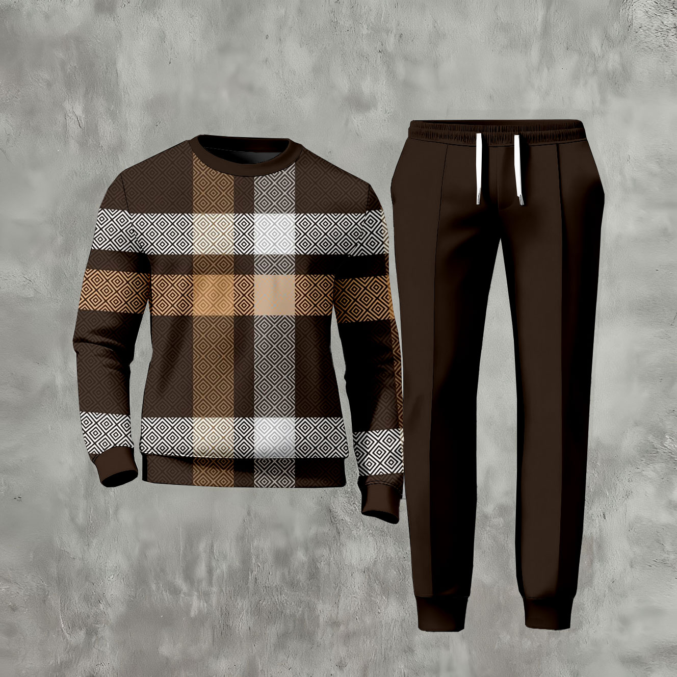 Men's Casual Color Matching Checked Printed Round Neck Long Sleeved & Sweatpants Deep Coffee Two-Piece Set