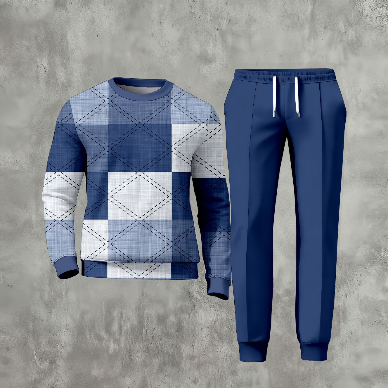 Men's Casual Denim Blue Color Matching Checked Printed Round Neck Long Sleeved & Sweatpants Two-Piece Set