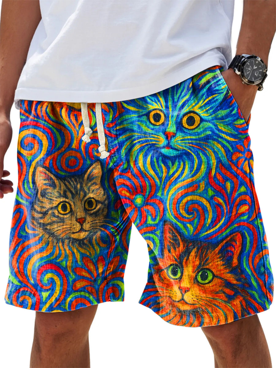 Men's Multicolor Cat Abstract Print Cotton And Linen Beach Shorts