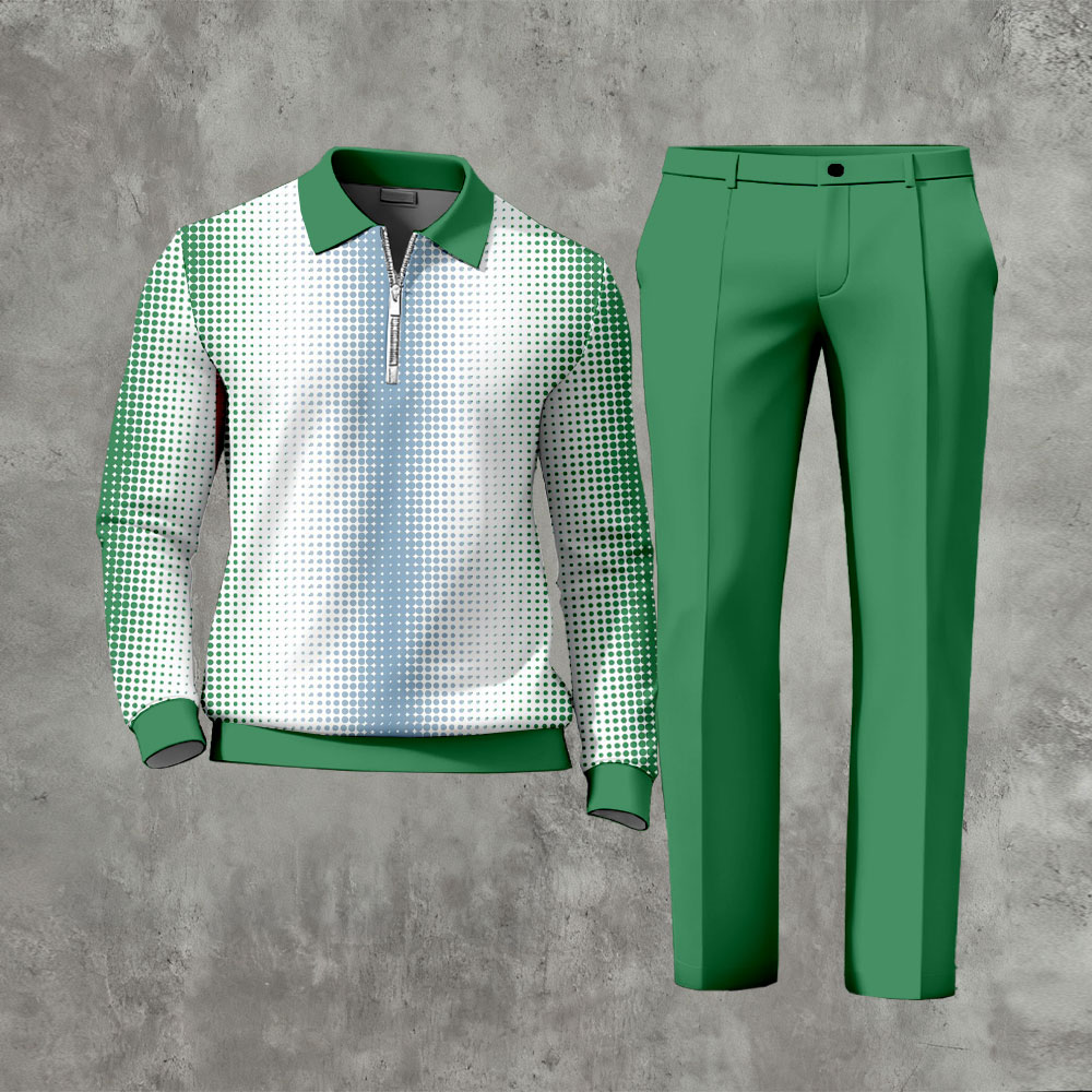 Men's Casual Gradient Polka Dot Print Polo Collar Zipper Long Sleeve Pants Two-Piece Set