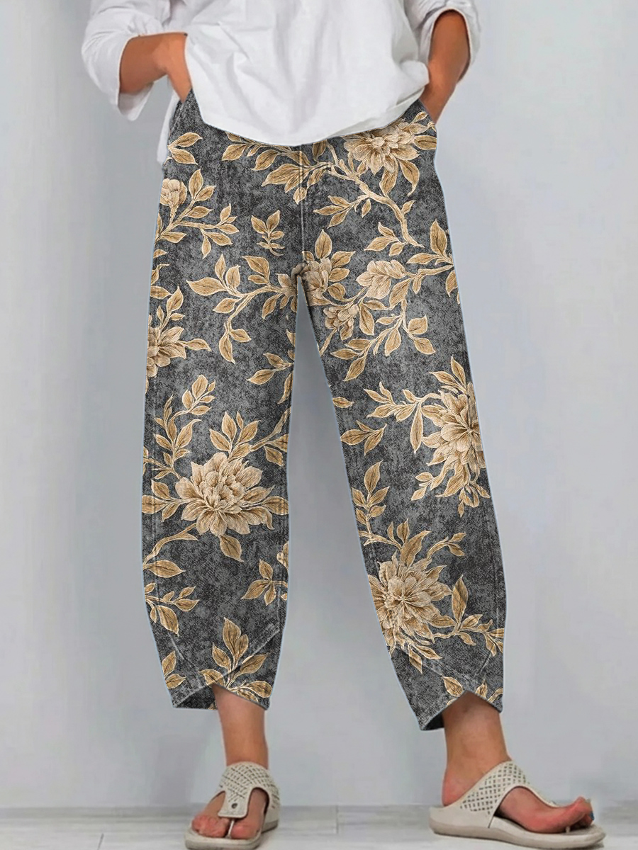 Women's Retro Floral Art Print Casual Washed Cotton Jeans