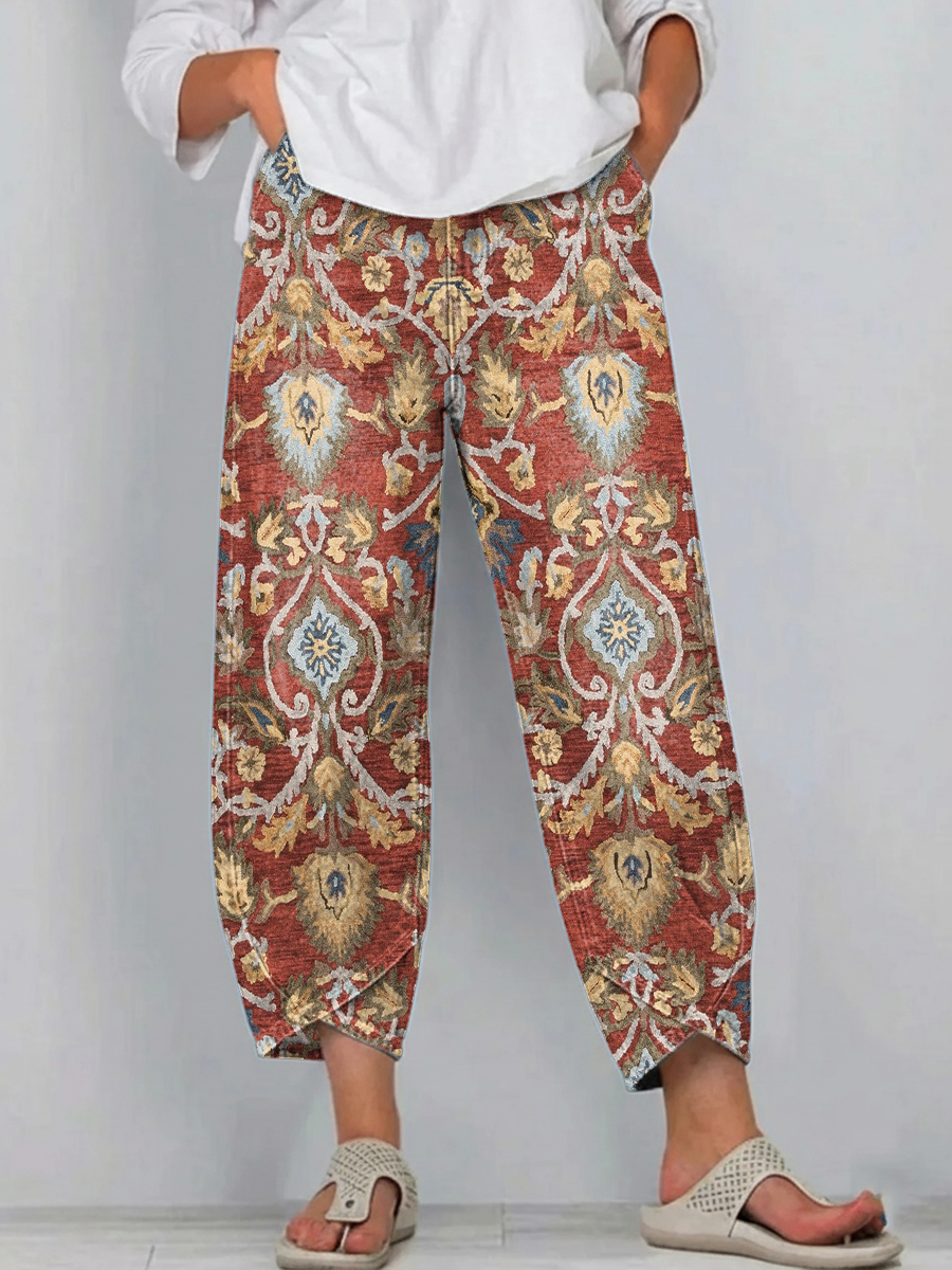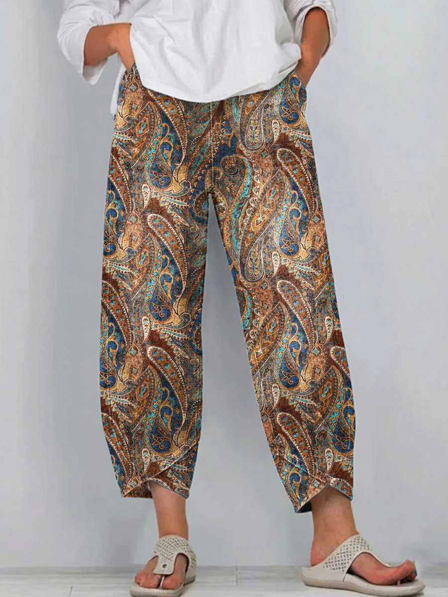 Women's Retro Bohemian Paisley Art Print Casual Washed Cotton Jeans