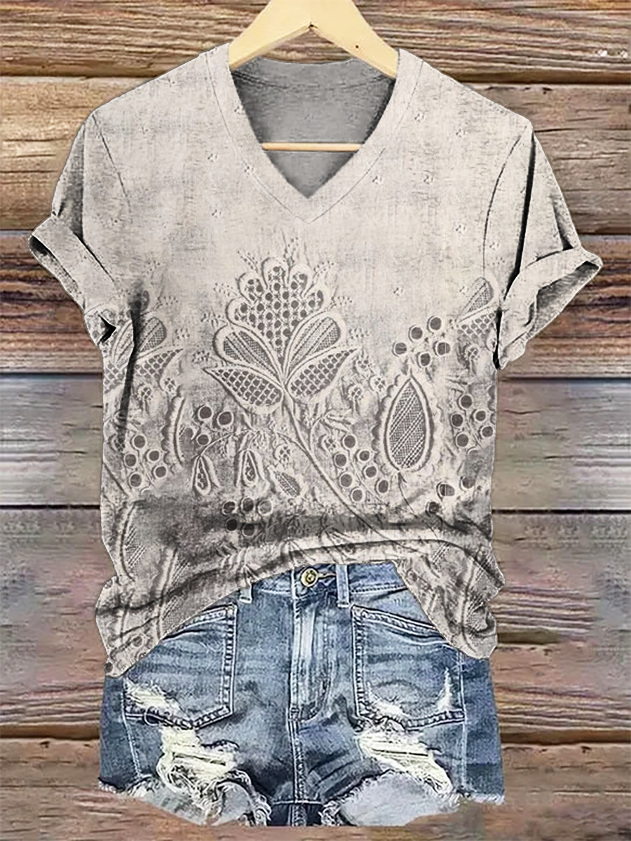Women's Vintage Floral Texture Patterns Print V-neck Casual T-Shirt