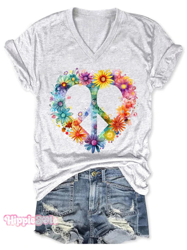 Women's Floral Peace And Love Art Print V-neck Casual T-Shirt