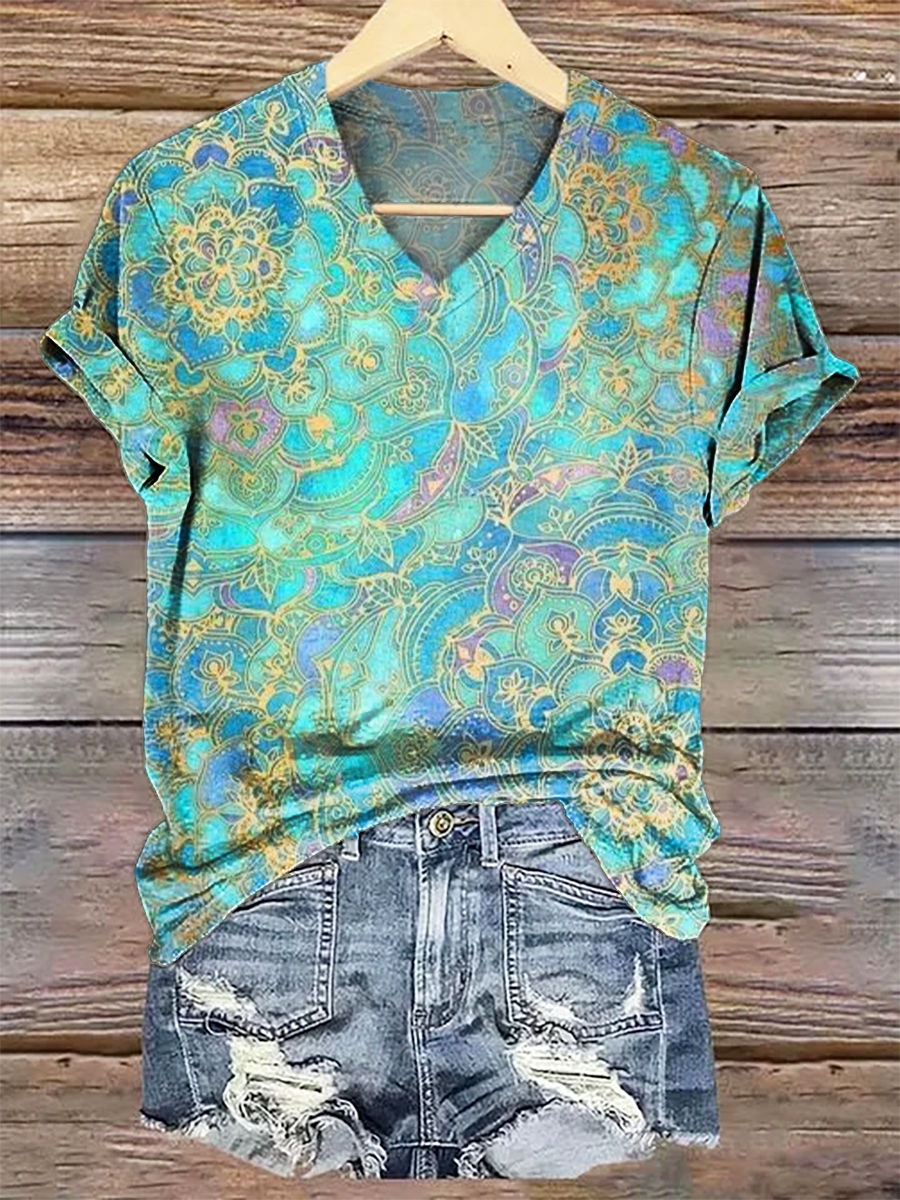 Women's Bohemian Floral Art Print V-neck Casual T-Shirt