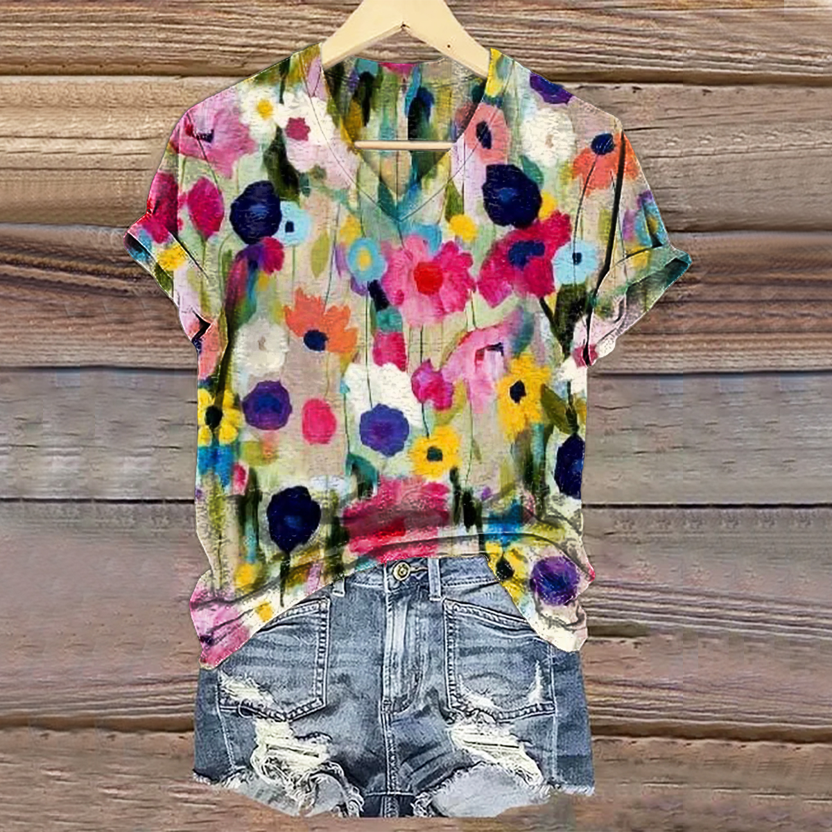 Daisy Peace Colorful Print V Neck T-Shirt