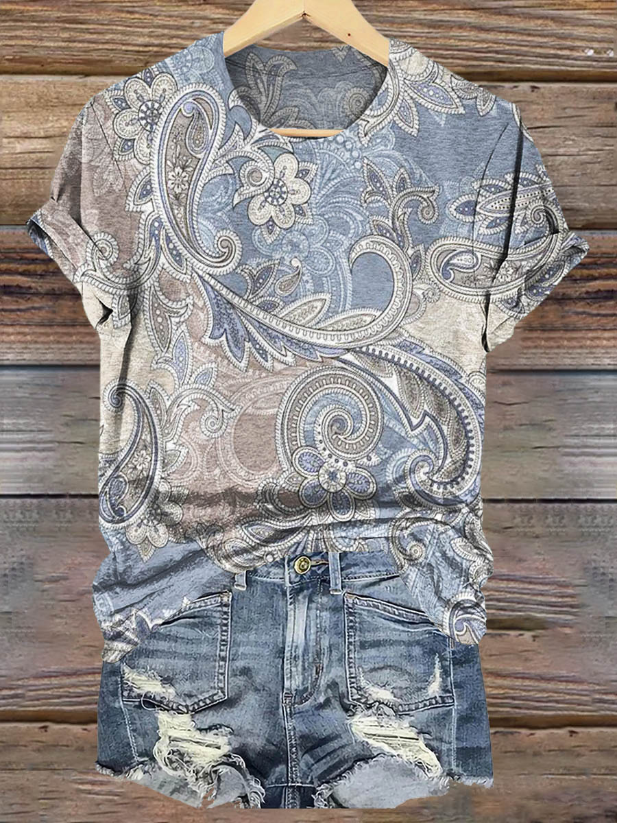 Women's Vintage Paisley Flower Pattern Print Crew Neck T-shirt