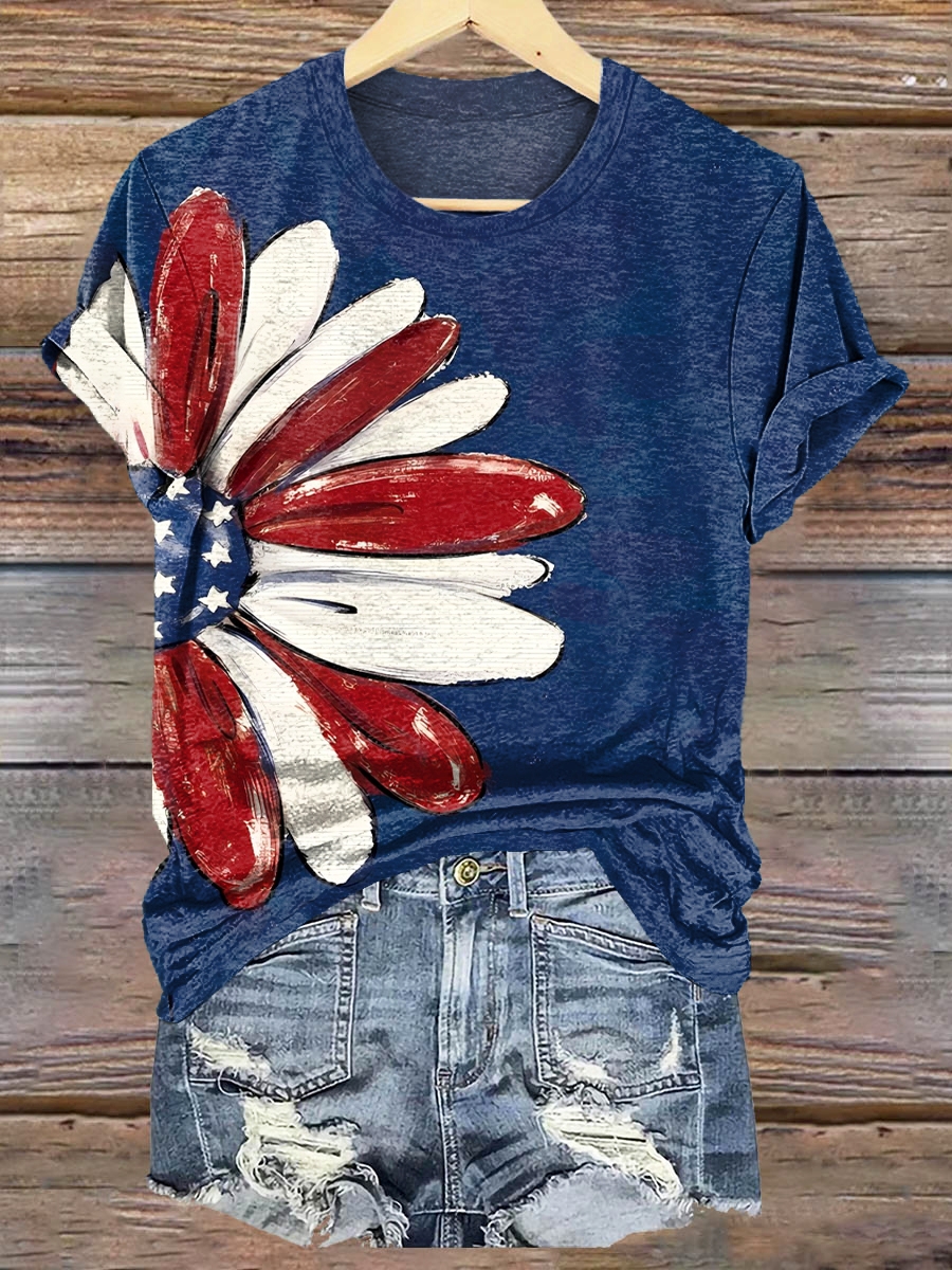 Women's Daisy American Flag Independence Day Print Crew Neck T-Shirt
