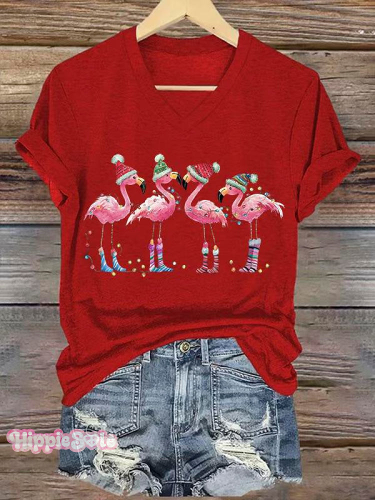 Women's Lovely Christmas Flamingo Art Print V-neck Casual T-Shirt