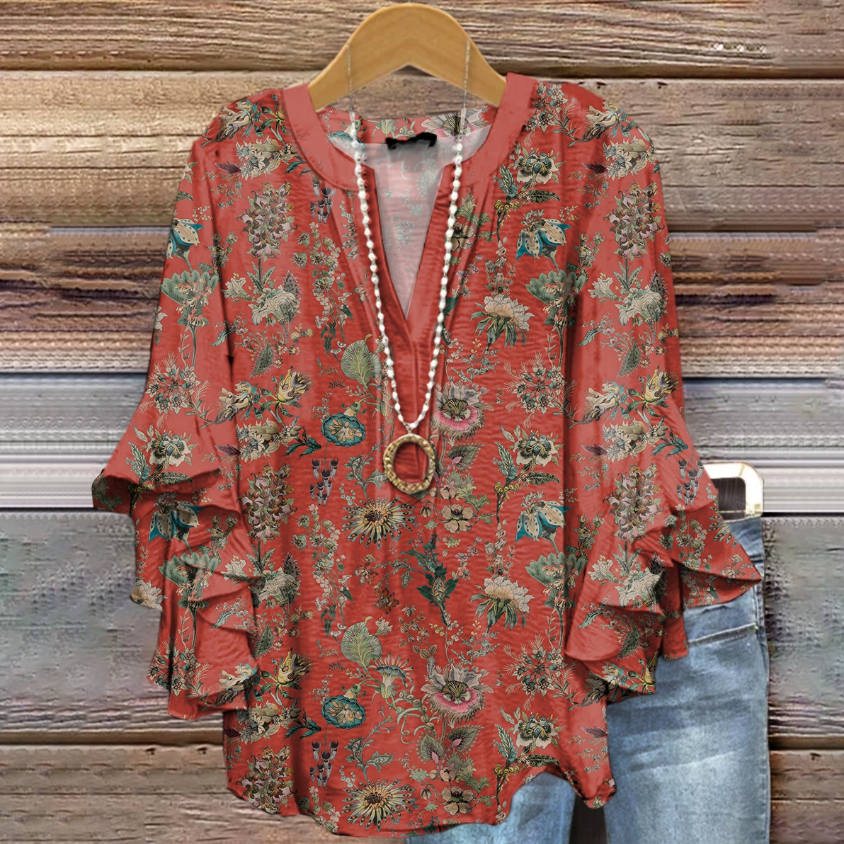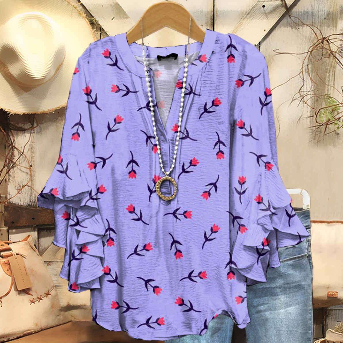 Women's Ethnic Floral Art Print Casual Ruffle Sleeve Top