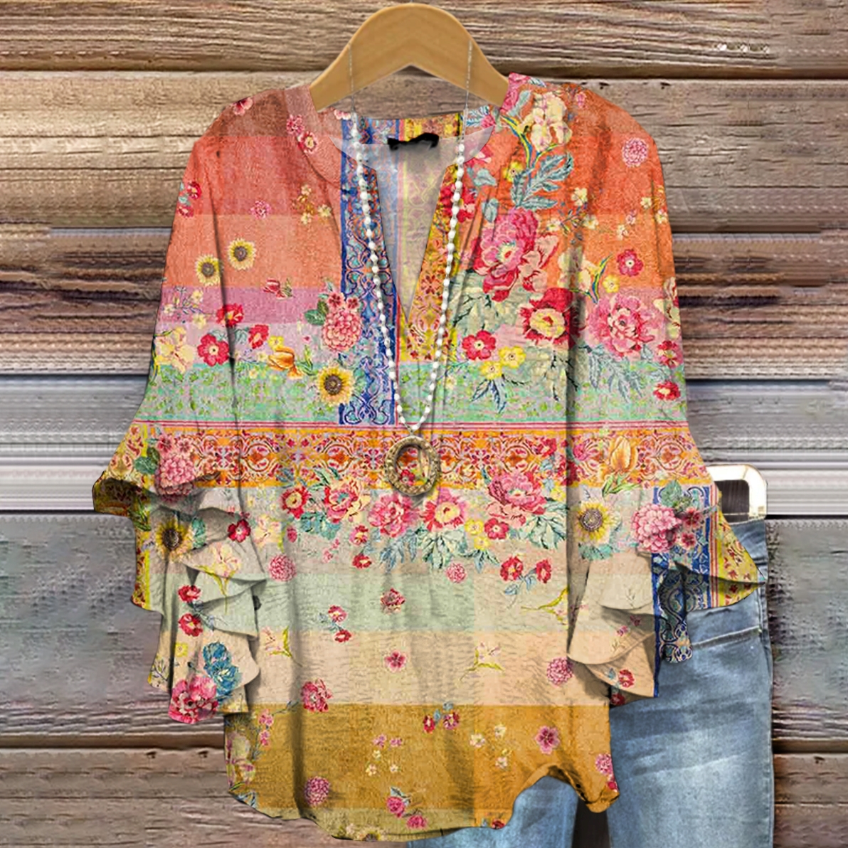 Women's Art Painting Ethnic Floral Contrast Retro Print V-Neck Ruffled Top