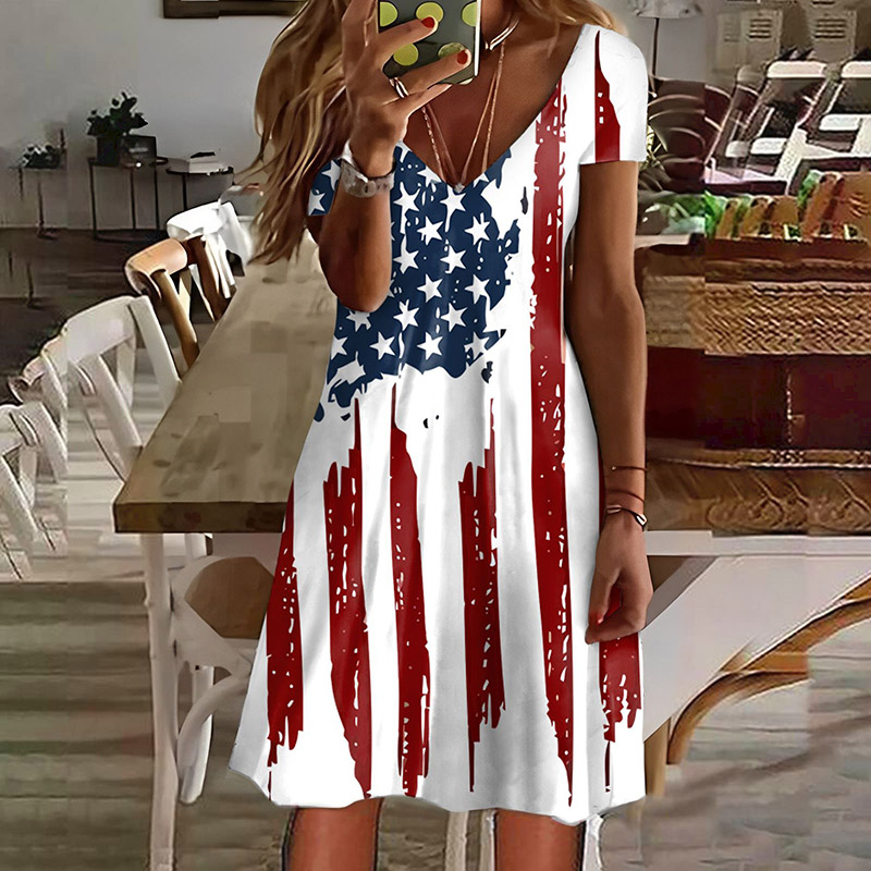 Women's Casual American Flag Print V Neck Short Sleeve Dress