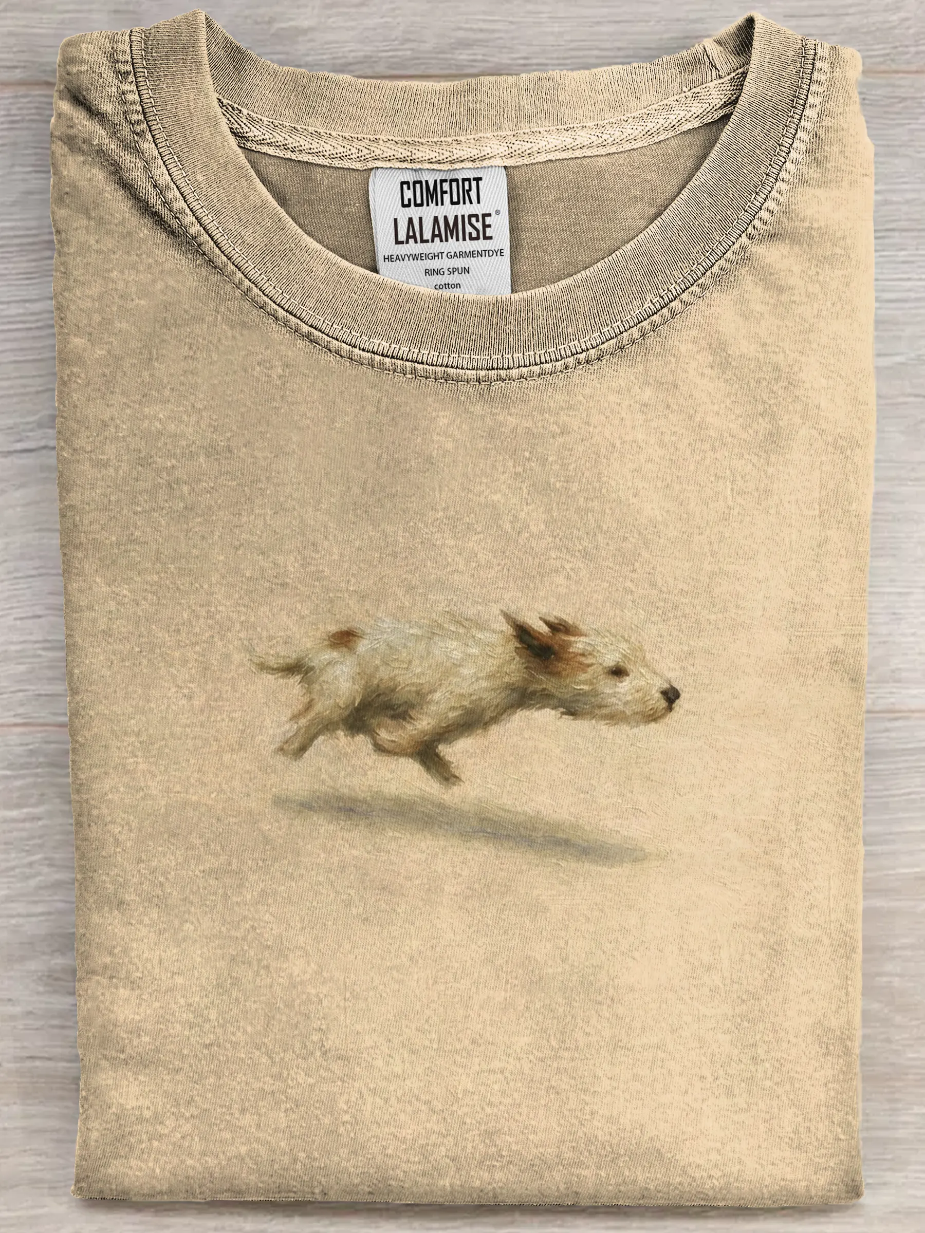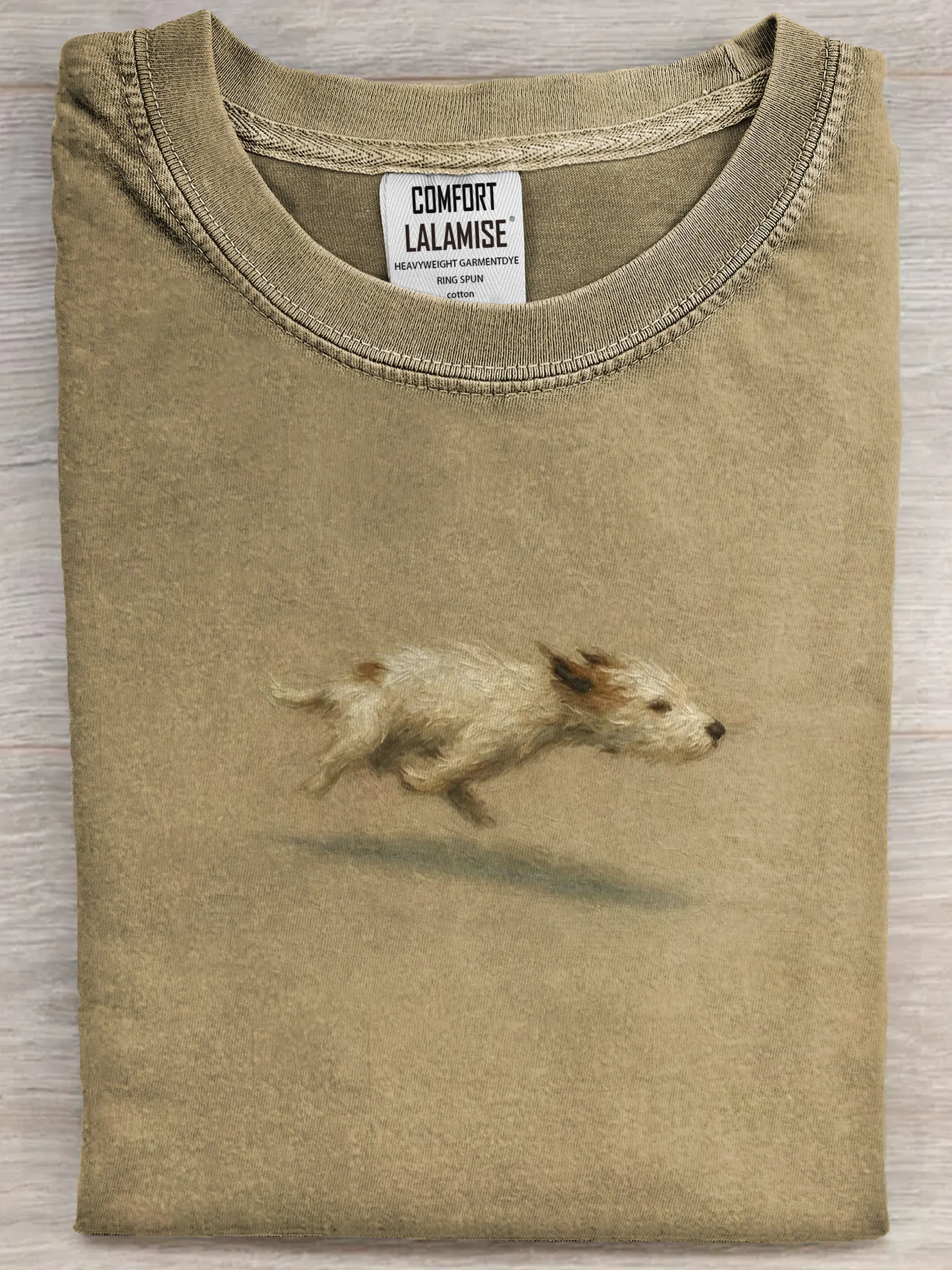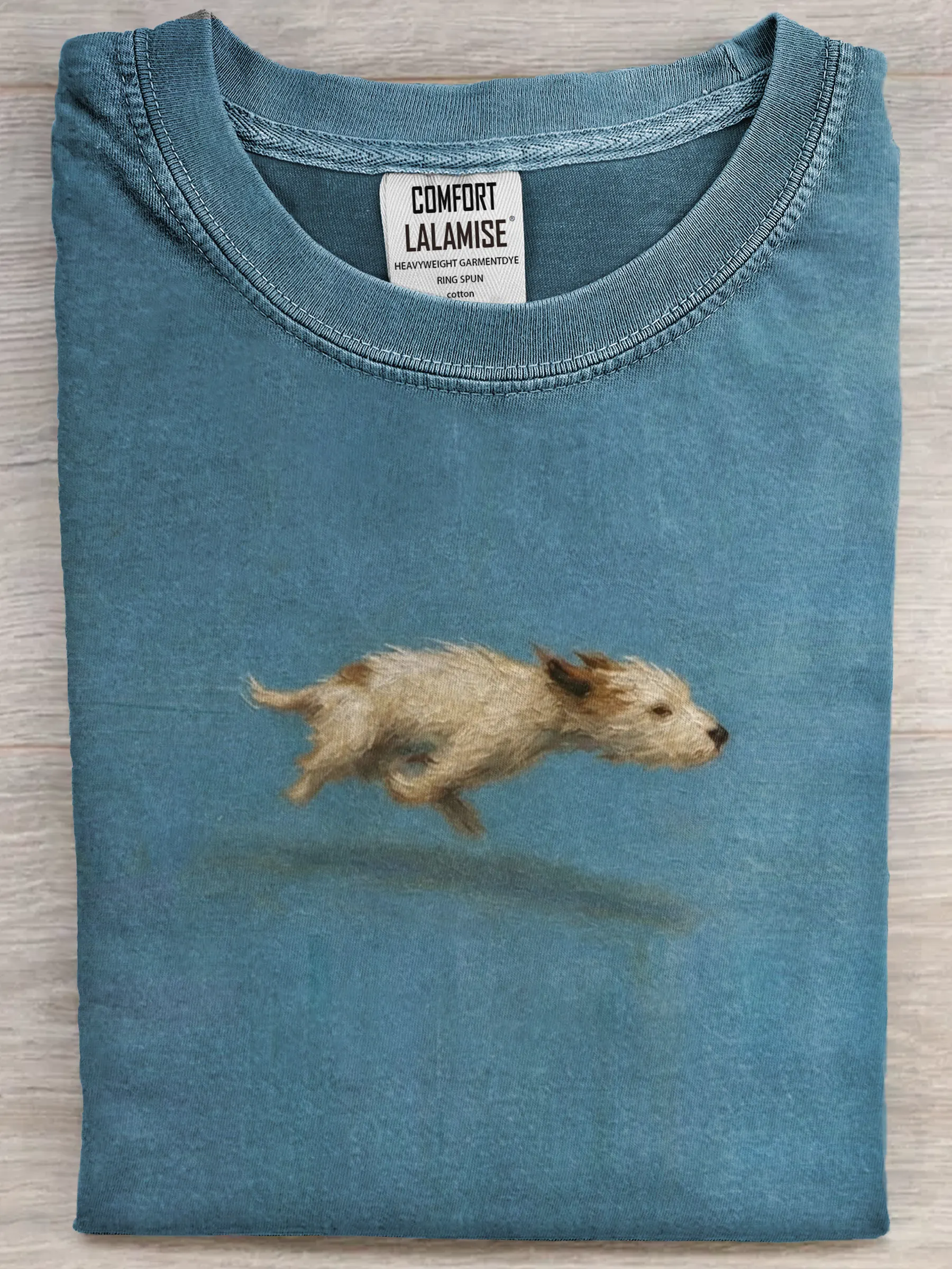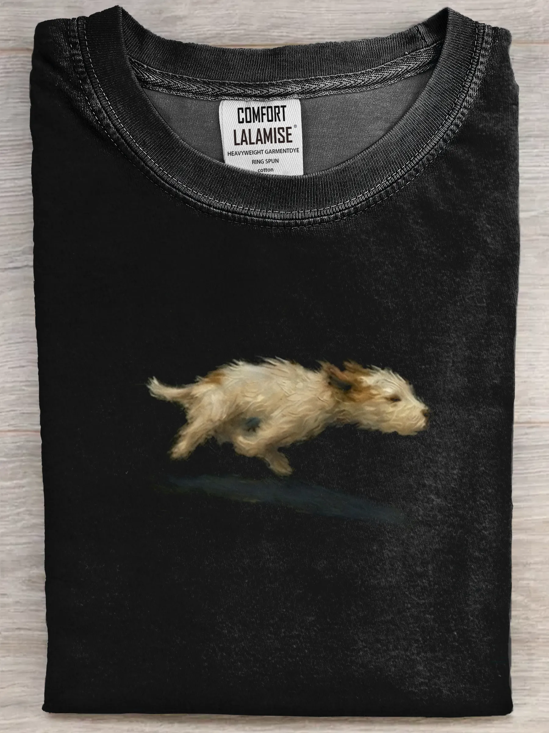 It captures the joyful moment of a dog in mid-run, adding a playful, feel-good touch that makes the design warm and charming — easy to wear, easy to love.