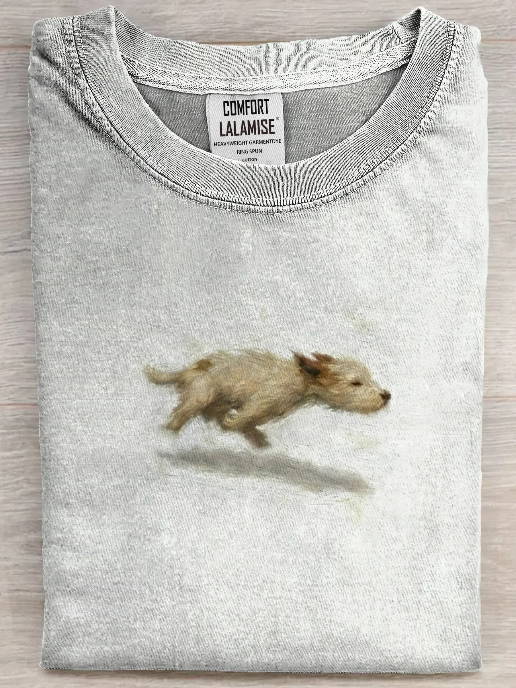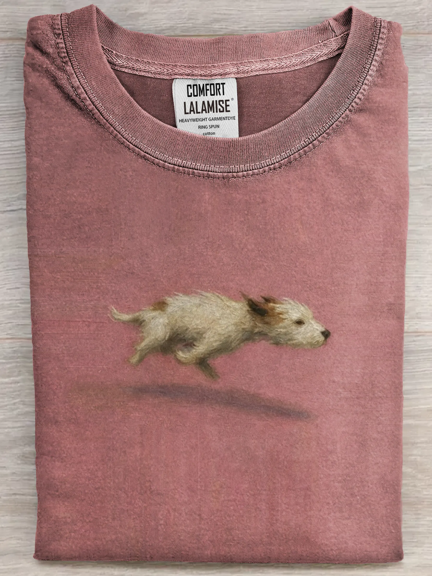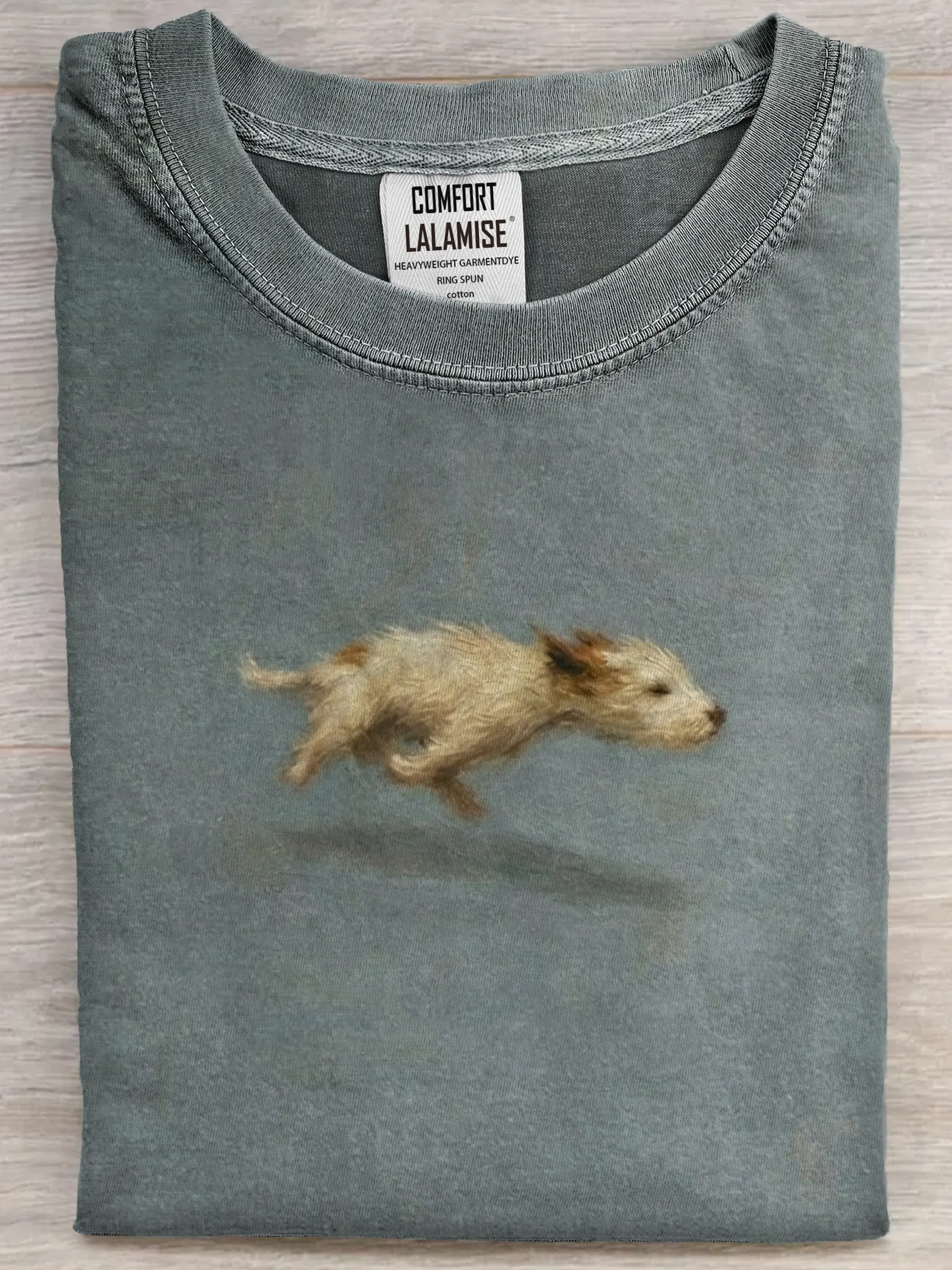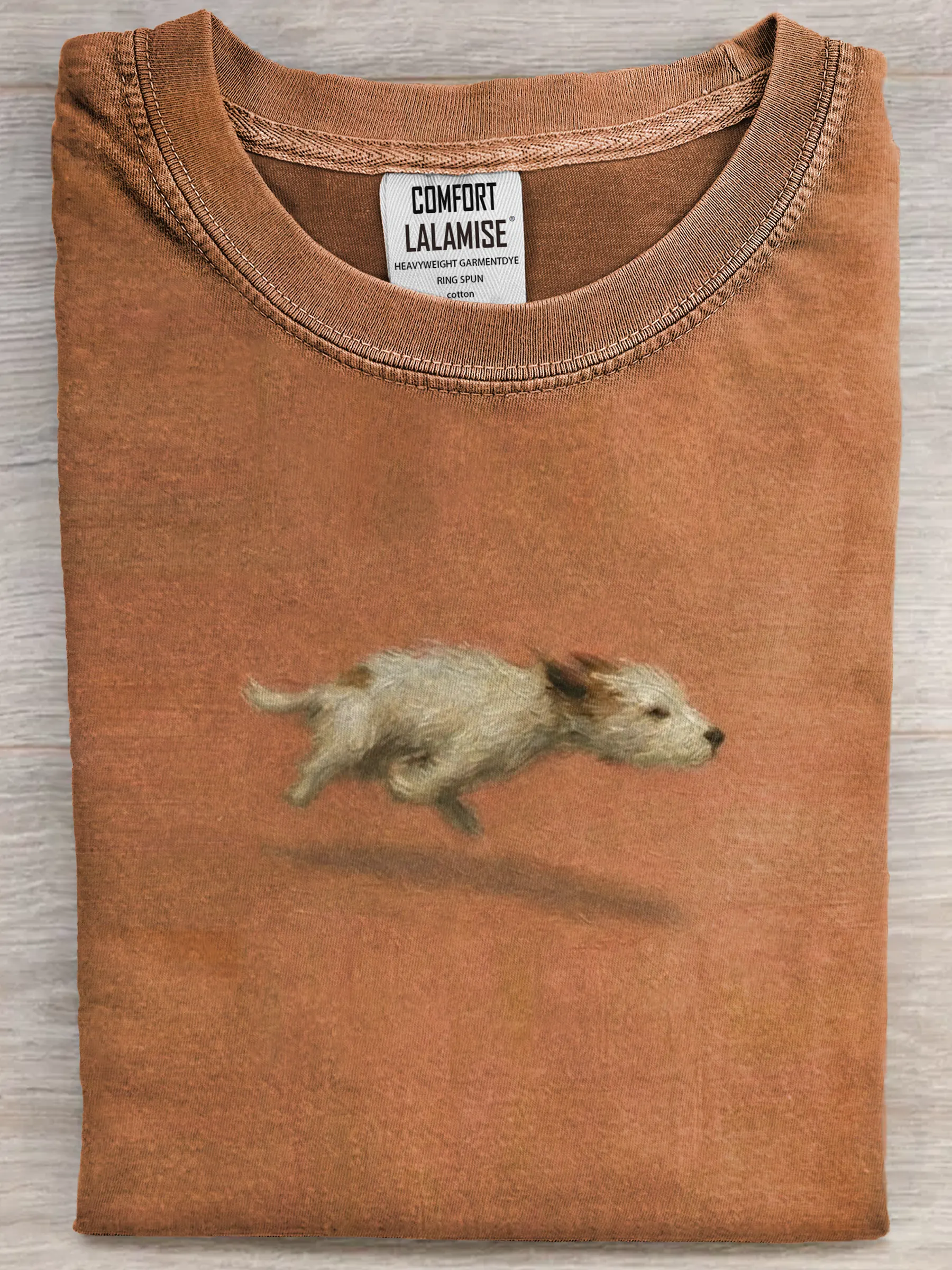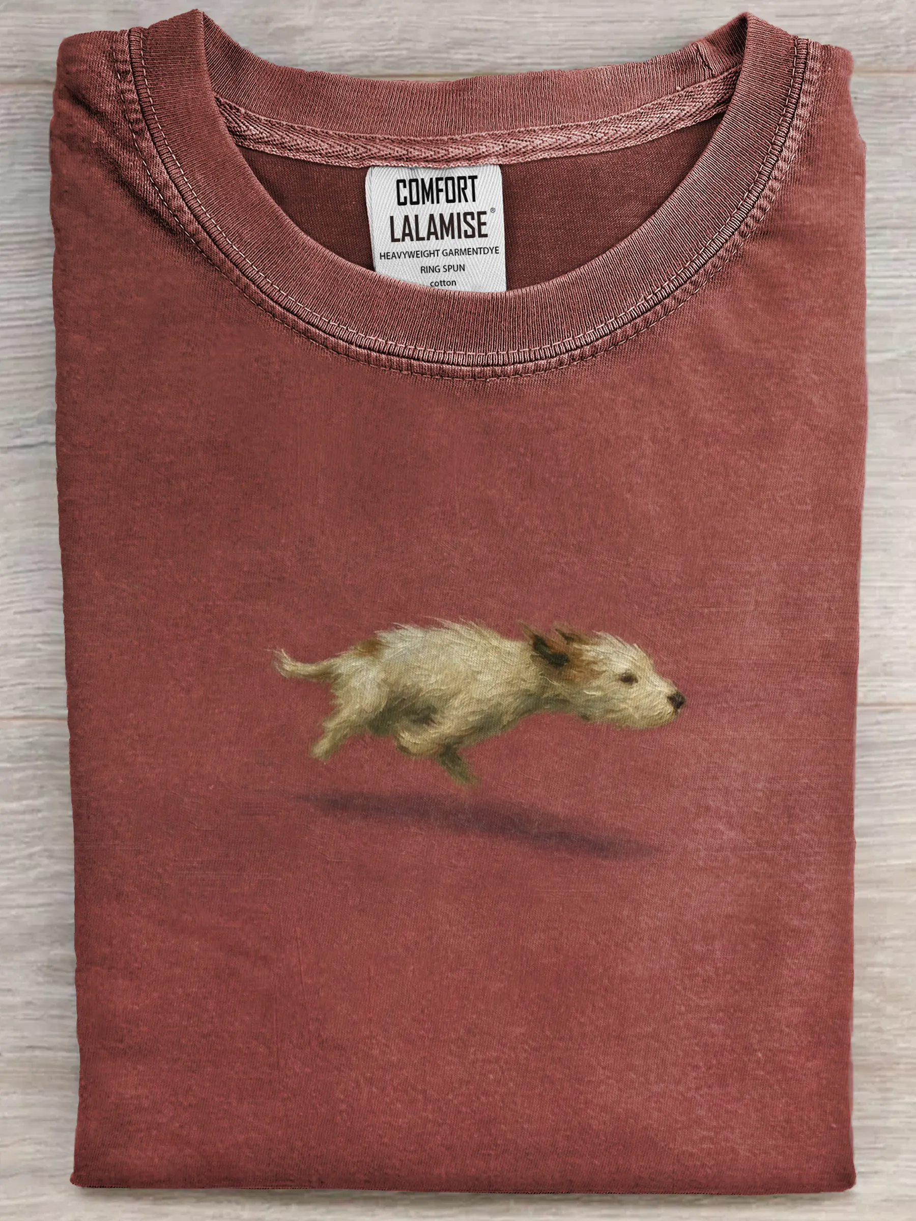 It captures the joyful moment of a dog in mid-run, adding a playful, feel-good touch that makes the design warm and charming — easy to wear, easy to love.