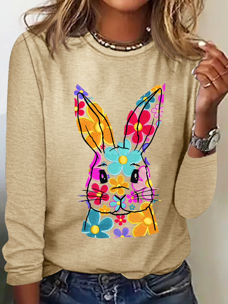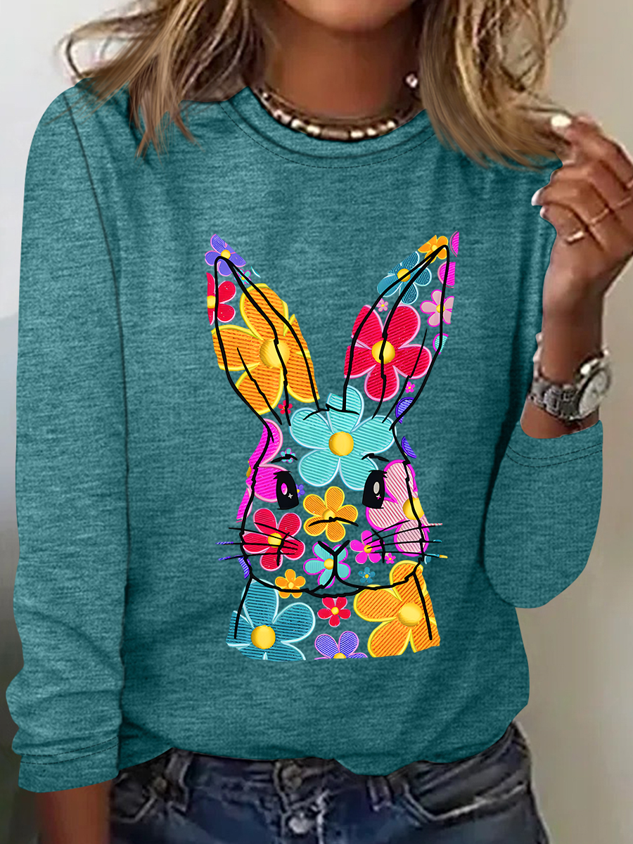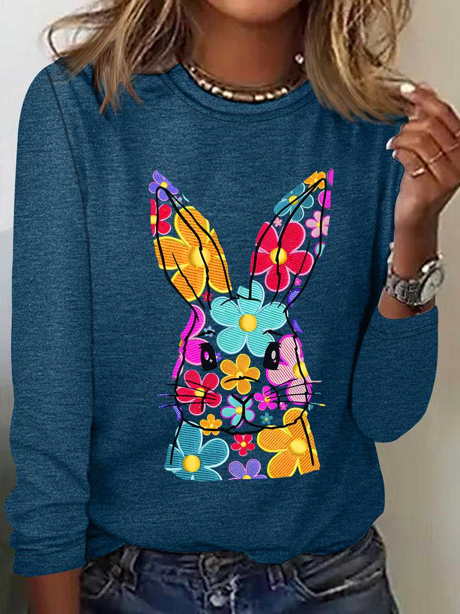 Happy Easter Bunny Flowers Print Casual Long Sleeve Shirt
