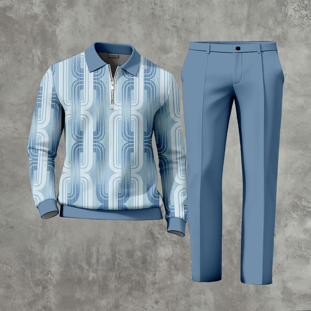 Men's Casual Gradient Retro Texture Print Polo Collar Zipper Long Sleeve Pants Two-Piece Set