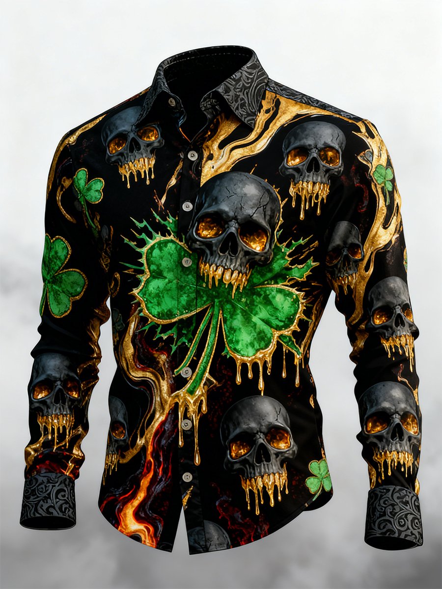 Men's Retro St. Patrick's Day Skull Long-Sleeved Shirt