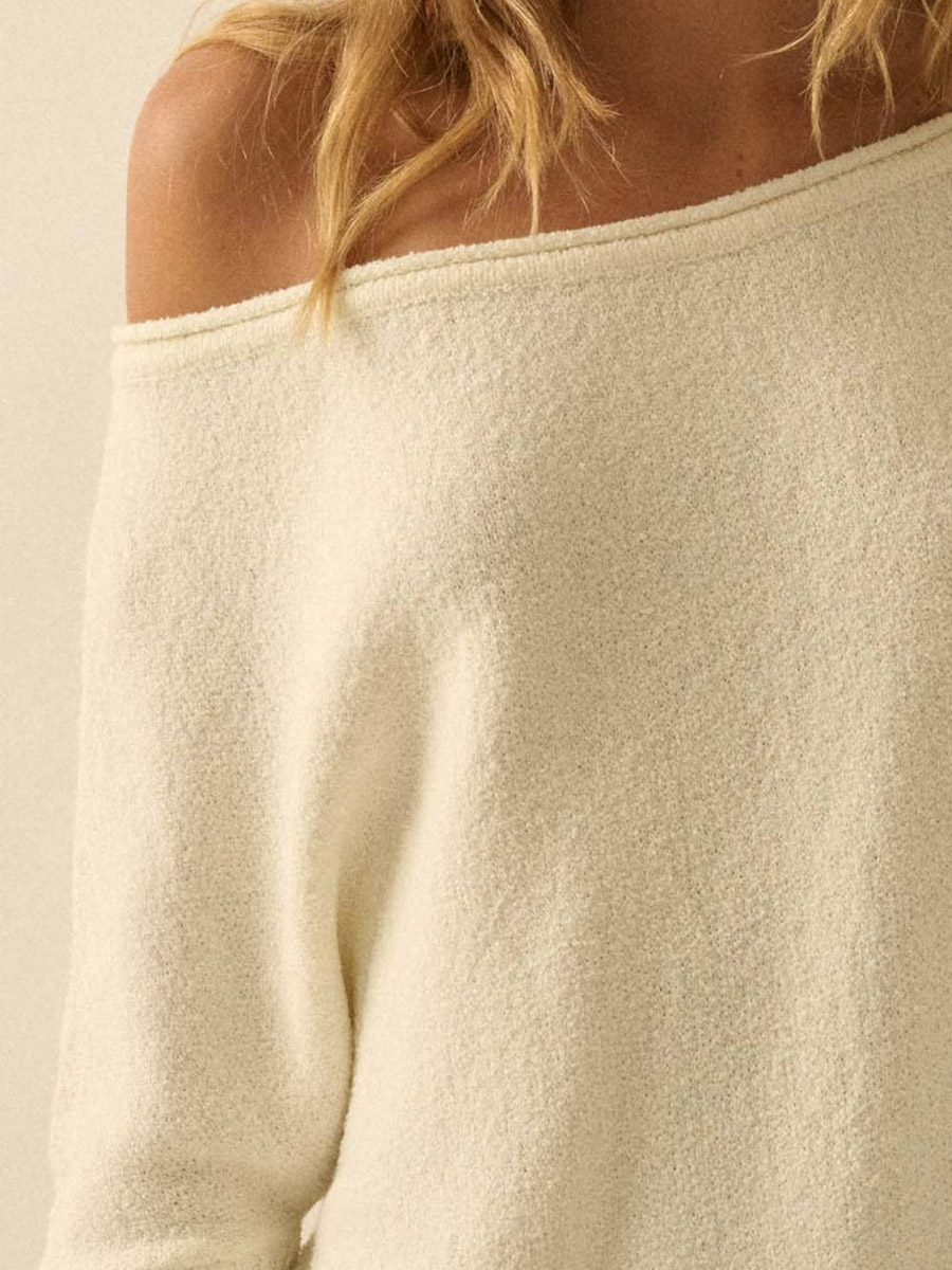 A cozy base for endless days, this long sleeve featured in a knit sweater fabrication with a flattering boat neckline and slouchy dolman sleeves.
