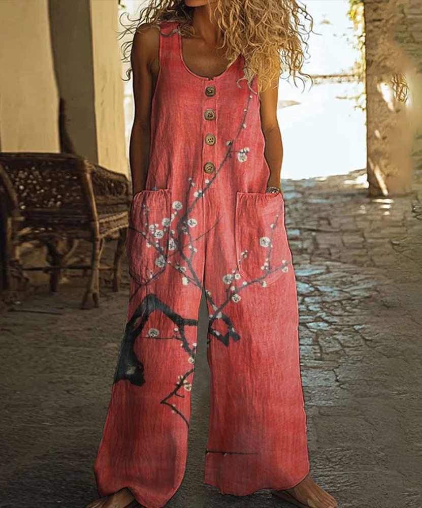 Retro Plum Blossom Art Print Casual Wide-Leg Jumpsuit