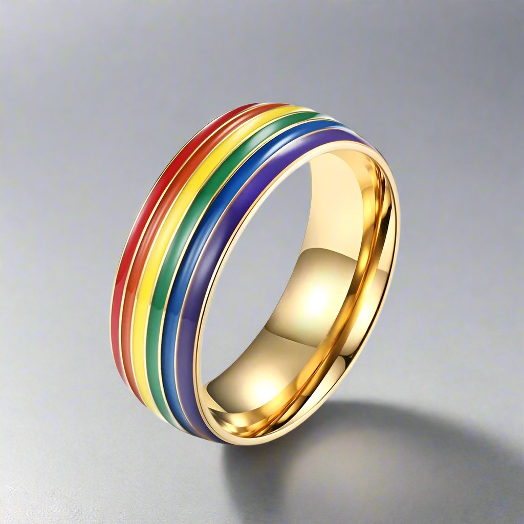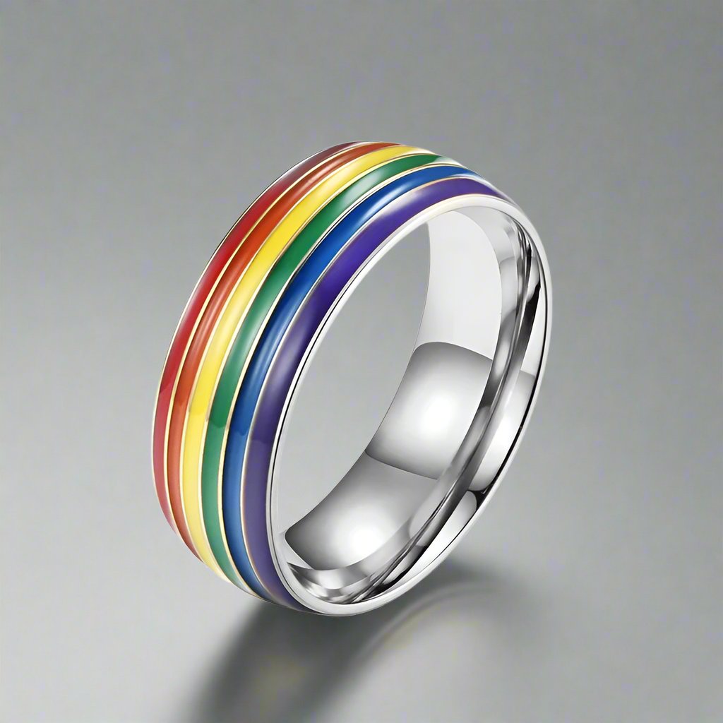 This ring proudly features the vibrant colours of the pride flag, creating a radiant rainbow. Its design symbolizes not only your love but also your unwavering support for equality and inclusivity.