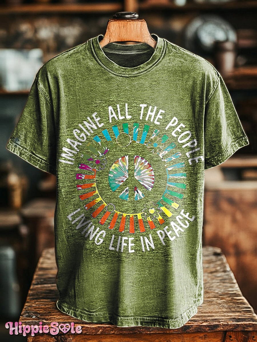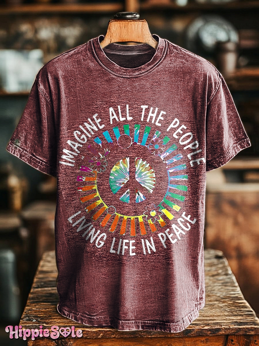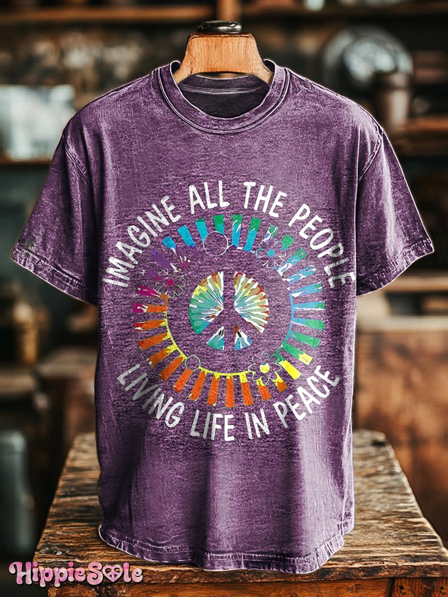 Unisex Hippie Imagine All The People Living Life in Peace Print Casual Loose Short Sleeve T-Shirt